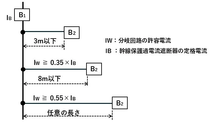 3m以内: 分岐点から3m以内に過電流遮断器が設置されている場合、分岐幹線の許容電流に関わらず省略可能です。