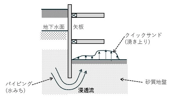 掘削底面の地盤は砂質土ですので、弱ければ、地下水により浸透流の流れが強くなり、ボイリングが発生しやすくなります。